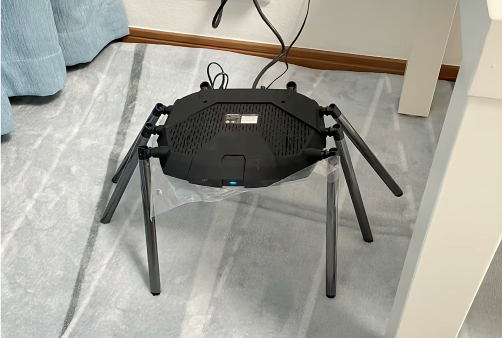 当然了,如果你把路由器摆成这种“赛博蜘蛛”的形状也是可完全的,因为天线虽然倒过来了,但它本质上也是垂直于地面的(而且你还能让别人觉得你家的路由器很酷)。